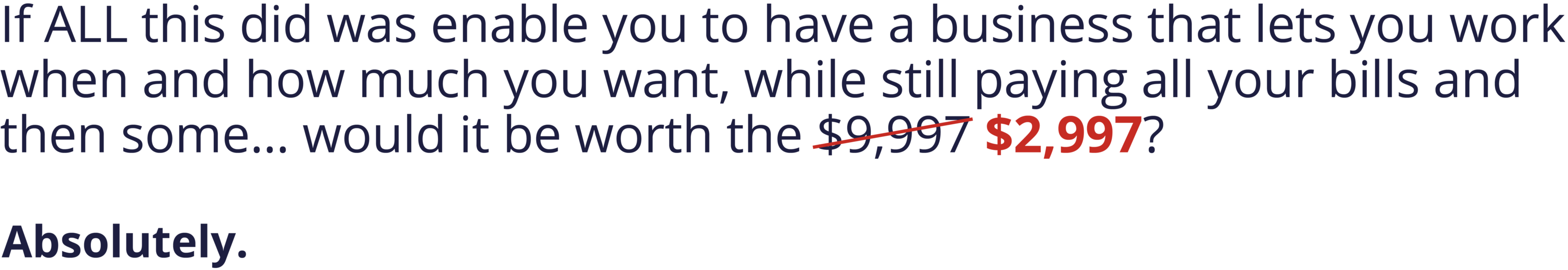 By now, you can probably see why I charge folks $50,000+ to walk them through setting up my S.C.A.L.E. method into their business (which is still a STEAL considering just how much revenue is added and how much stress is reduced, over time).